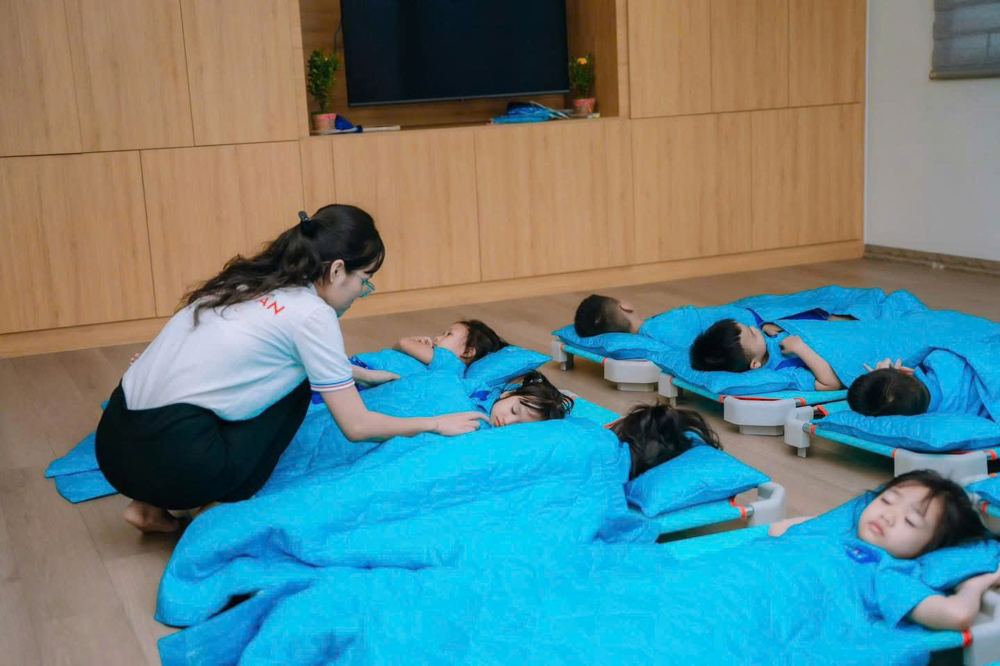 Phòng học thiết kế mở, thân thiện với trẻ nhỏ, hệ thống điều hòa 2 chiều, sàn gỗ hiện đại, khu vệ sinh nam/nữ riêng từng lớp.