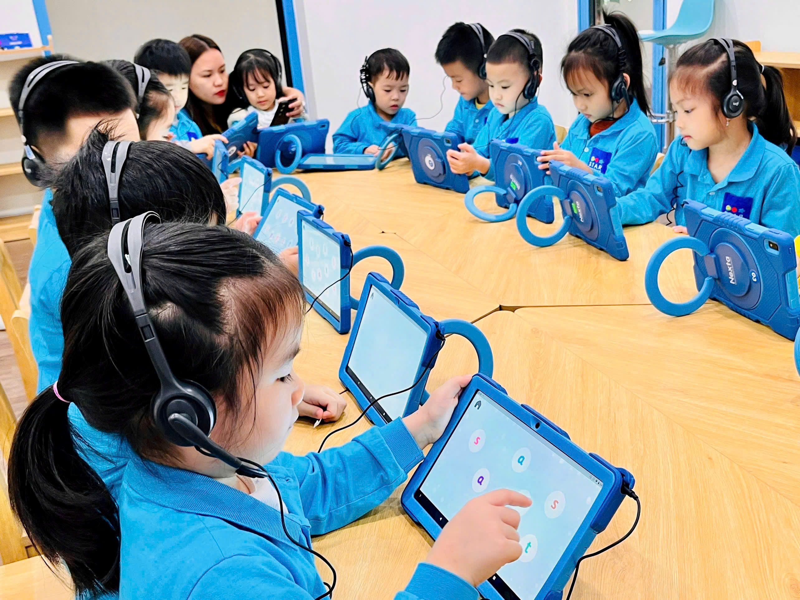 Lớp học thông minh với máy tính bảng, bảng tương tác giúp trẻ tiếp cận công nghệ một cách tự nhiên, hình thành kỹ năng số và tư duy công nghệ.