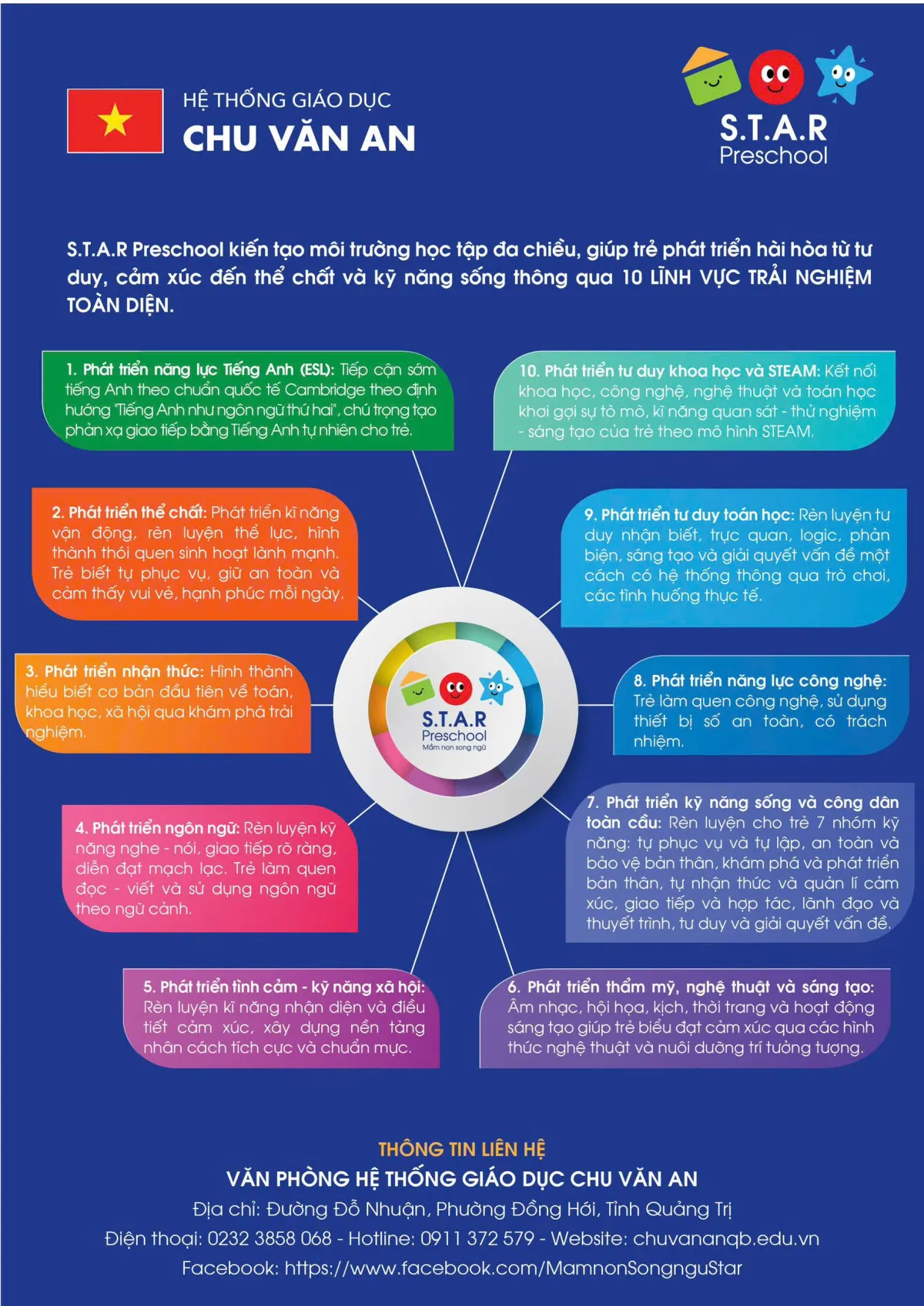 S.T.A.R Preschool là điểm khởi đầu trong hành trình giáo dục liên cấp của Hệ thống giáo dục Chu Văn An. S.T.A.R Preschool hướng đến mục tiêu trở thành trường mầm non chất lượng cao hàng đầu tại khu vực miền Trung và Việt Nam - tiên phong về chương trình tích hợp Quốc tế, đặt nền tảng giáo dục thế hệ công dân toàn cầu có trí tuệ, nhân cách và bản sắc Việt.